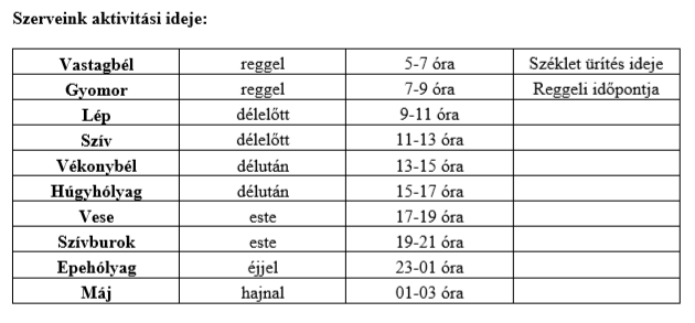 Nagyon fontos az étkezési időpontokat betartani. A különböző szerveinknek más - más aktivitási ideje van, ehhez alkalmazkodnunk kell, ha egészségünket meg szeretnénk tartani. Testünk minden egyes szervének van egy kétórás időtartamú időszaka, amikor az aktivitása a legmagasabb. Ha ezek figyelembe vételével alakítjuk ki életritmusunkat, szolgáljuk vele egészségünket.