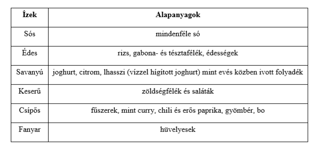A megfelelően megkomponált ételek ízben és színben szintén hozzájárulnak az egészség megőrzéséhez. Jelenjen meg étkezésünkben a hatféle íz mindegyike, ezek megléte együttesen minden étkezésnél az Ayurvéda szerint előkészíti az emésztőszerveket feladatuk tökéletes teljesítésére. - Az édes íz aktivizálja a hasnyálmirigyet, a savanyú élénkíti és erősíti a gyomor mirigyeit és a legerősebben hat a nyálelválasztásra, a keserű íz tisztító hatású és serkenti az epe és máj működését, a csípős íz élénkíti az anyagcserét, melegít és tisztít, a fanyar íz összehúzó hatású és nyálkahártya-nyugtató, étvágygerjesztő és vízháztartást befolyásoló.